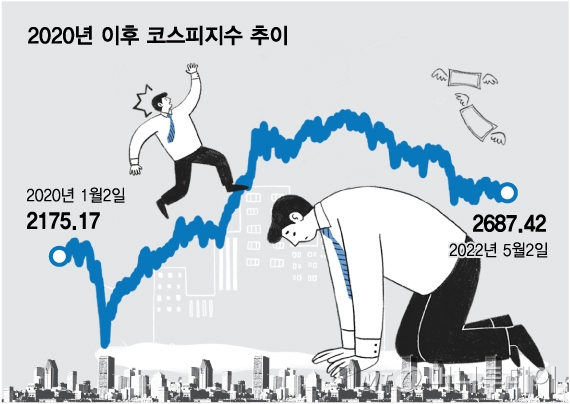 2일 코스피는 지난해 고점(3316.08, 2021년 6월25일) 대비 19.0% 하락한 2687.45에 마감했다. 코스피는 19% 하락했지만 개인 투자자 계좌는 반토막 상황이다. 특히 2020년 1월 이후 주식시장에 진입한 투자자의 43.5%가 코스피 3000선 위에서 주식을 매수한 것으로 나타났다. 개미의 대대수가 물려있다는 얘기다. 게다가 지수가 내리면 내릴수록 추가 하락에 대한 공포는 커진다.