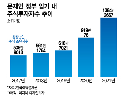 한국예탁결제원에 따르면 지난해 12월 기준 주식투자자 수는 약 1384만명(법인 소유자 등 포함)으로 집계됐다. 2017년 말 506만명에서 2.7배 늘었다.