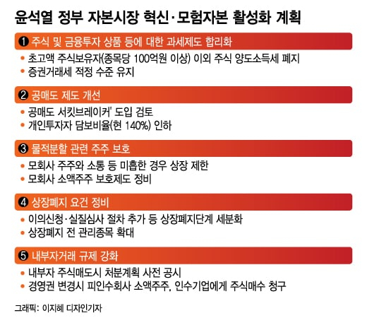 또 물적분할 후 자회사를 상장할 경우 주주보호 장치가 미흡하면 상장을 제한하는 장치를 마련한다. 상장사 내부관계자가 주식을 매도할 땐 처분계획 사전 공시의무가 새롭게 도입된다. 윤석열 대통령의 대선 공약이던 공매도 '서킷브레이커(일시정지)'의 도입도 추진된다.