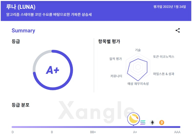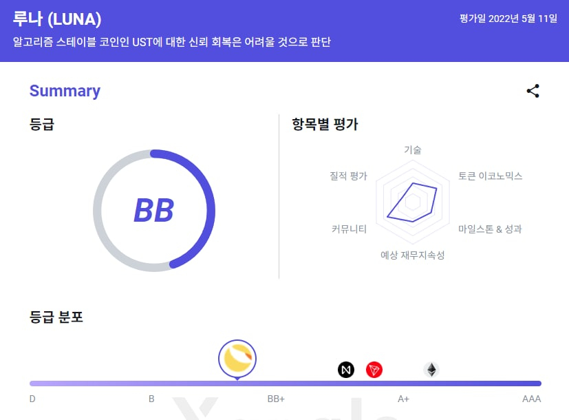 가상자산 평가 서비스를 하고있는 쟁글도 "테라의 지속 가능성에 의문이 발생했다"며 등급을 BB로 조정했다. 불과 3개월 전까지만 해도 쟁글의 평가는 'A+'였다.