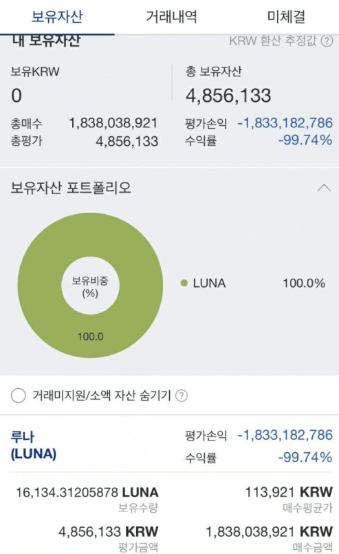 루나 투자자로 추정되는 한 누리꾼은 루나에 18억원을 넣었다가 약 485만원만 남은 내역을 캡처해 올렸다. 또다른 누리꾼의 캡처 사진에는 10억원을 투자했다가 9억4300만원을 잃은 내역이 나와 있었다.