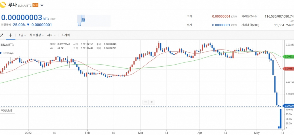 특히 이날 오전 글로벌 거래소 1위인 바이낸스가 루나의 상장폐지를 결정하면서 국내이용자 일부는 국내 거래소로 물량을 이동한 것으로 추정된다. 국내 거래소 가운데 업비트는 원화마켓이 아닌 비트코인마켓(BTC)마켓에만 루나를 상장시켜 입출금 거래를 막지 않았다.