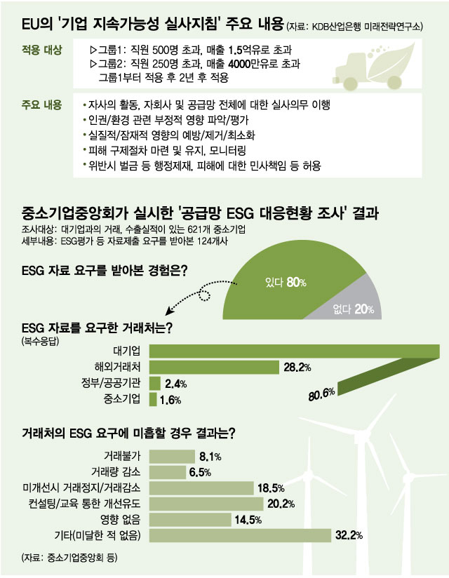 그러나 ESG를 둘러싼 변화의 움직임은 점차 가시화되고 있다. ESG 경영이 더 이상 대기업들이나 신경쓰면 될 이슈가 아니라는 인식이 커지고 있다는 얘기다. 올 3월 하순부터 한 달간 중소기업중앙회는 최근 2년간 대기업과 거래하거나 수출 실적이 있었던 중소기업 621개사를 대상으로 '공급망 ESG 대응현황' 조사를 진행했다.