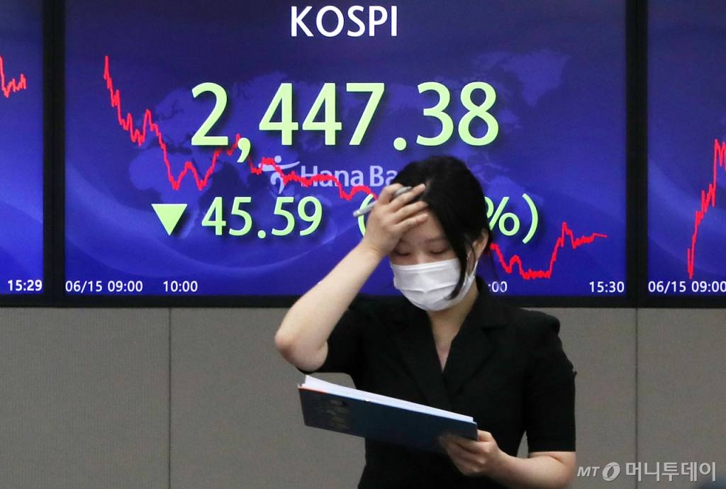 15일 코스피지수는 전일 대비 45.59포인트(-1.83%) 내린 2447.38에 마감했다. 장중 코스피는 2440선이 무너진 2436.04까지 내리면서 연중 최저치를 새로 썼다. 시가총액은 1927조원으로 전일보다 35조원 넘게 줄었다. 3거래일 연속 2000조원을 밑돌았다.