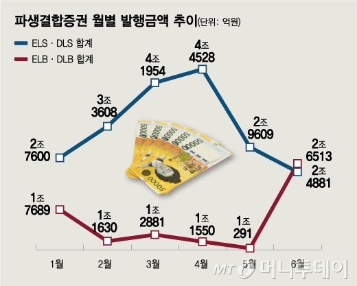 6월 ELB와 DLB 발행금액을 합치면 총 2조6513억원으로 같은 달 ELS(주가연계증권)와 DLS(기타파생결합증권) 발행금액 총합(2조4881억원)을 넘어선다. ELB·DLB 발행금액이 ELS·DLS 발행금액을 넘어서는 건 이례적인 일이다.