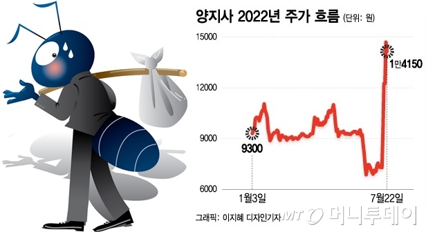 양지사는 김씨의 갑작스런 대량 매수에 지난 15일 종가 7280원에서 18, 19일 2연속 상한가를 기록했다. 21일에 추가로 20% 급등하며 4일 만에 101.9% 올랐다.