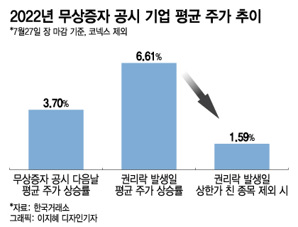 그렇다면 주가가 상대적으로 저렴해 보이는 권리락 발생일에는 실제로 주가가 폭등했을까. 27일까지 권리락이 발생한 45개 종목의 권리락 발생일 평균 주가 상승률은 6.61%였다.