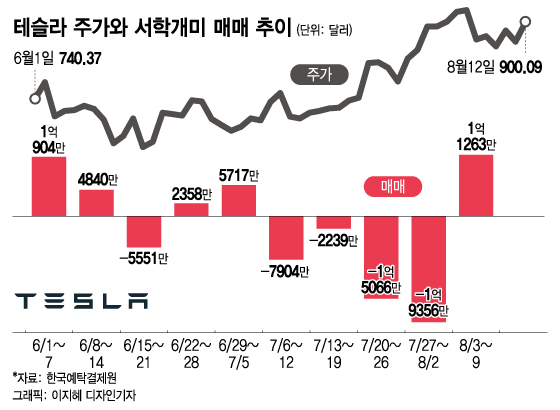 서학개미들은 테슬라가 지난 7월6일 695.20달러에서 지난 8월2일 901.76달러로 27.9% 급등했던 4주 동안 순매도를 계속하며 총 4억4565만달러를 팔아치웠다.