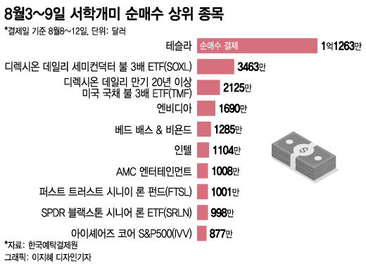 서학개미들은 이 기간 동안 ICE 반도체지수의 하루 수익률을 3배로 추종하는 SOXL(3463만달러)을 비롯해 엔비디아(1690만달러)와 인텔(1104만달러)을 순매수했다.