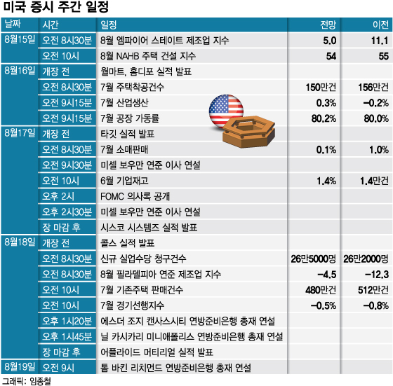 가장 주목되는 일정은 오는 17일 오후 2시에 나오는 지난 7월 연방공개시장위원회(FOMC) 의사록이다. 지난 6월 소비자 물가상승률이 9.1%로 정점을 찍은 것으로 발표된 직후 열린 FOMC에서 어떤 의견들이 오갔는지 주목된다.