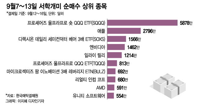 서학개미들이 지난 7~13일 동안 가장 많이 순매수한 종목은 나스닥100지수의 하루 수익률을 반대로 3배 따르는 프로셰어즈 울트라프로 숏 QQQ ETF(SQQQ)였다.