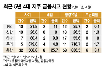 21일 국회 정무위원회 소속 윤창현 의원이 금융감독원으로부터 제출받은 '2018년부터 2022년 6월까지 4대금융지주 금융사고 현황' 국정감사 자료에 따르면 KB·우리·신한·하나 금융지주 소속 은행과 보험, 카드사에서 발생한 금융사고는 모두 104건, 확인된 사고금액은 1347억1000만원이다.