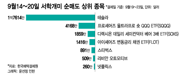 서학개미들은 직전 5거래일(9월7~13일)에도 테슬라를 1억1964만달러 순매도했다.