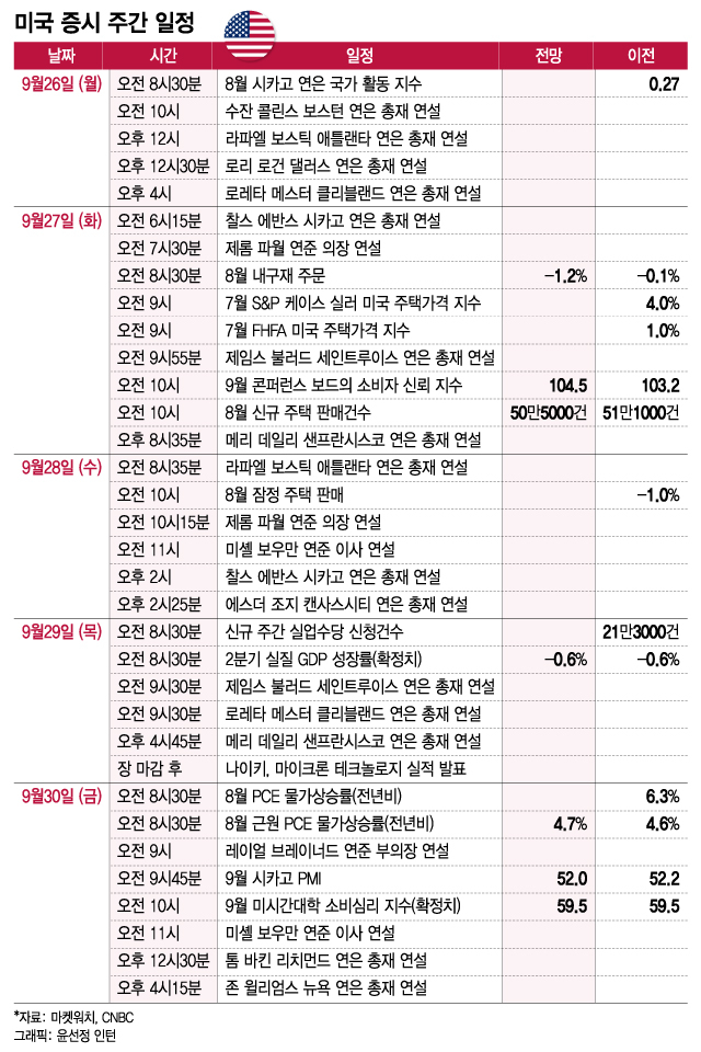 이런 가운데 이번주 증시 움직임과 관련해 주목해야 할 것은 △지난주 급등세를 보인 국채수익률과 △오는 30일 발표되는 지난 8월 개인소비지출(PCE) 물가상승률 및 미시간대학의 소비자 기대 인플레이션, △이번주 내내 이어지는 연준(연방준비제도) 인사들의 연설이다.