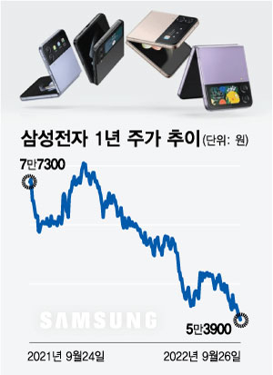 26일 코스피 시장에서 삼성전자(224,500원 ▲7,000 +3.22%)는 전일대비 600원(1.10%) 내린 5만3900원에 거래를 마감했다. 장중 5만3600원 52주 신저가를 경신했지만 이날 코스피 지수(-3.02%) 보다 양호한 하락세를 기록했다. 주가가 5% 넘게 급락한 개별종목이 많았던 증시 상황을 고려하면 삼성전자는 오히려 선방한 편이었다.