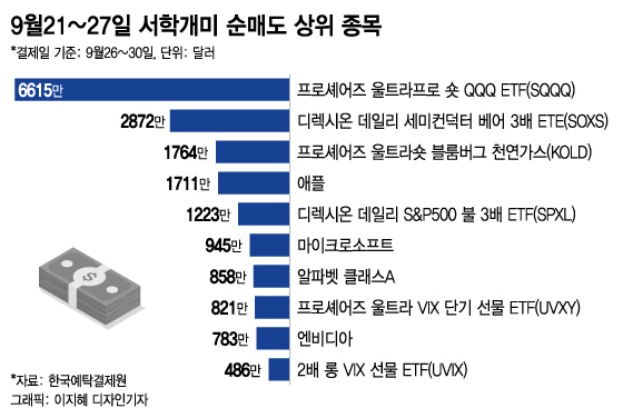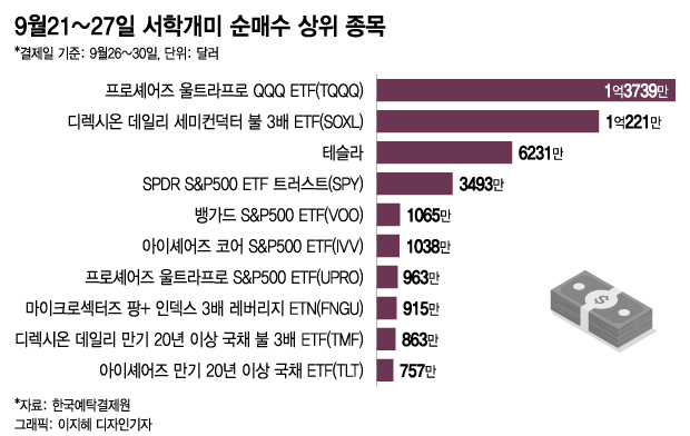 서학개미들이 9월14~20일 주간과 21~27일 주간에 가장 많이 순매수한 종목도 동일하다. 프로셰어즈 울트라프로 QQQ ETF(TQQQ)와 디렉시온 데일리 세미컨덕터 불 3배 ETF(SOXL)이다.