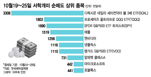 서학개미들이 지난 19~25일 사이에 가장 많이 팔아치운 종목은 증시가 오를 때 수익을 얻는 롱(매수) 포지션의 ETF(상장지수펀드)들이다.