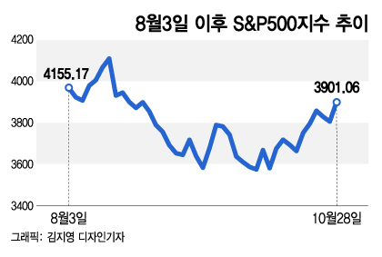 S&P500지수는 지난 10월12일 3577.03을 저점으로 상승세를 이어오고 있다. 지난 28일엔 3901.06으로 마감하며 지난 9월15일 이후 처음으로 3900 위에서 거래를 마쳤다.