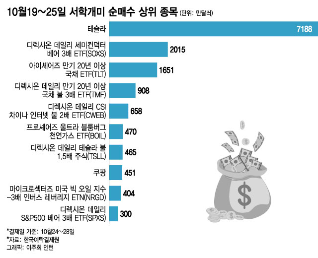 그러나 역시 서학개미들의 '원픽'(하나의 선택)은 테슬라였다. 서학개미들은 지난 19~25일 사이에 테슬라를 7188만달러 순매수했다.