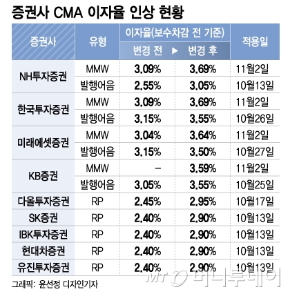 시중금리 상승에 따라 증권사들도 경쟁적으로 CMA 금리 인상에 나섰다. CMA는 단 하루만 맡겨도 이자를 받을 수 있는 증권사 '파킹통장'이다.