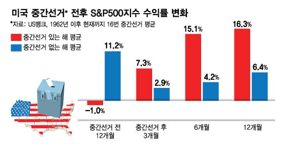 유에스뱅크 분석에 따르면 1962년 이후 현재까지 16번의 중간선거에서 선거 전후 주가 수익률에는 큰 차이를 보였다. 중간선거 전 12개월 간 S&P 500은 평균 1% 하락한 반면 선거 이후 3개월, 6개월, 1년 평균 수익률은 7.3%, 15.1%, 16.3%로 나타났다.