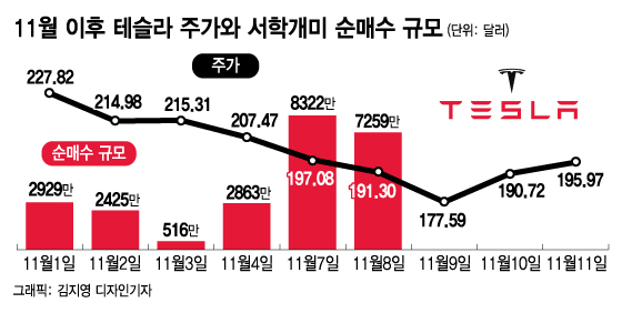 서학개미들이 이같이 테슬라를 폭풍 매수한 것은 주가 200달러 미만은 확실한 저평가 영역이라고 믿기 때문으로 보인다. 테슬라 주가는 지난 9일 177.59달러까지 추락했다가 11일 195.97달러로 회복됐다.