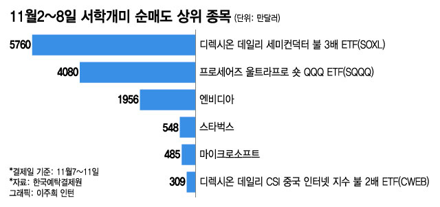 서학개미들은 이 기간 동안 ICE 반도체지수의 하루 수익률을 3배 따르는 디렉시온 데일리 세미컨덕터 불 3배 ETF(SOXL)를 가장 많은 5760만달러 순매도했다.