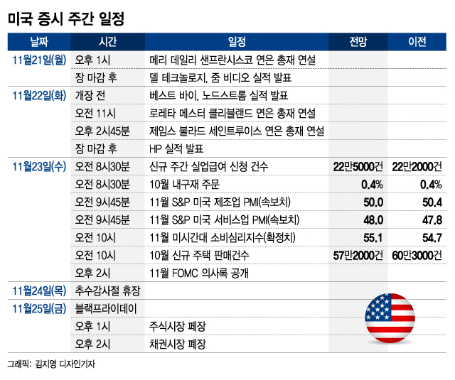 추수감사절 다음날인 25일은 연중 가장 큰 폭의 할인행사가 시작되는 블랙프라이데이로 주식시장은 오후 1시에, 채권시장은 오후 2시에 조기 폐장한다. 블랙프라이데이를 포함한 이번주말 유통업체 판매 실적은 다음주 증시에 영향을 미칠 것으로 보인다.