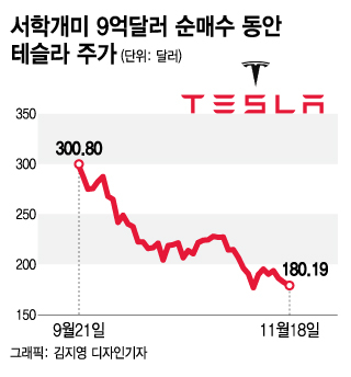 하지만 서학개미들이 지난 15일까지 테슬라를 9억달러 이상 순매수하는 동안 주가는 37% 추락했다. 지난 9월21일부터 지난 18일까지 약 두 달간 수익률은 마이너스 41.6%에 이른다.