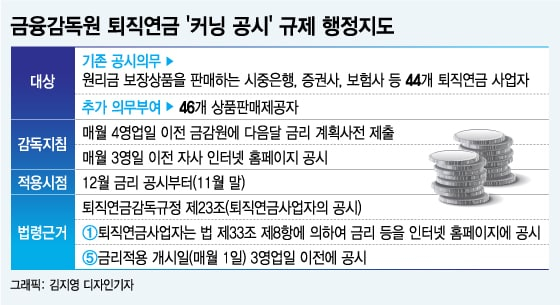 금감원이 공시 이율을 사전에 받아본 것은 일부 금융사가 '꼼수'로 퇴직연금 이율을 높이는 이른바 '커닝 공시'를 막기 위해서다. 기존에는 퇴직연금 사업자만 매달 '다음달 3영업일 전'에 각사 홈페이지에 퇴직연금 이율을 동시에 공시했다. 이에 따라 일부 저축은행, 보험사, 증권사, 수협 등 상품판매제공자는 퇴직연금 사업자들이 공시한 이율을 다 살펴본 후 이 보다 높은 수준에서 이율을 정할 수 있었다.