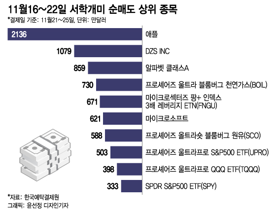 지난 16~22일 사이에 서학개미들이 가장 많이 팔아치운 종목은 애플로 2136만달러를 순매도했다.