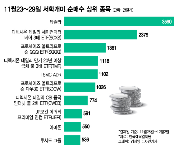 지난 11월 23~29일간에도 서학개미들이 가장 많이 순매수한 종목은 테슬라였다. 다만 규모는 3590만달러로 줄었다.