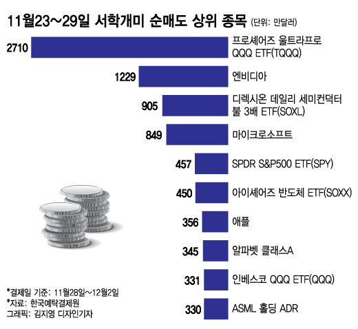 서학개미들은 각각 나스닥100지수와 ICE 반도체지수의 하루 수익률을 3배 추총하는 프로셰어즈 울트라프로 QQQ ETF(TQQQ)와 디렉시온 데일리 세미컨덕터 불 3배 ETF(SOXL)를 2710만달러와 905만달러씩 순매도했다.