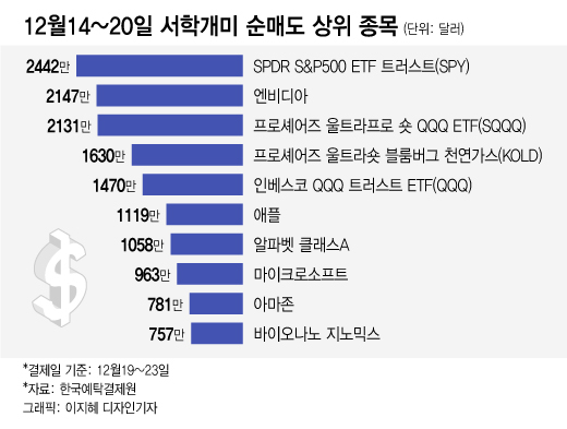 지난 14~20일 사이에 서학개미들이 가장 많이 순매도한 종목은 S&P500지수를 그대로 추종하는 SPDR S&P500 ETF 트러스트(SPY)로 2442만달러 매도 우위를 나타냈다.