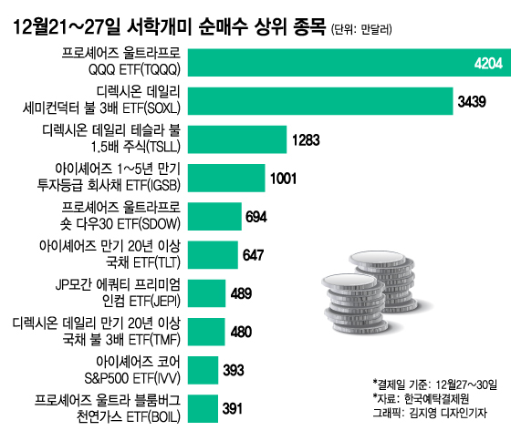서학개미들은 지난해 12월21~27일 사이에 나스닥100지수의 하루 수익률을 3배 추종하는 프로셰어즈 울트라프로 QQQ ETF(TQQQ)를 가장 많은 4204만달러 순매수했다.