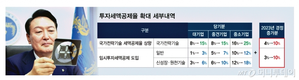 지난 3일 정부는 반도체 등 국가전략기술 시설투자 금액에 대해 대기업과 중견기업은 15%, 중소기업은 25%씩 세금을 깎아주는 방안을 추친한다고 밝혔다. 올해 적용되는 한시적 국가전략기술 시설투자 증가분에 대한 10% 추가 세액공제를 감안하면 대기업은 최대 25%, 중소기업은 최대 35% 세액공제를 받을 수 있다.