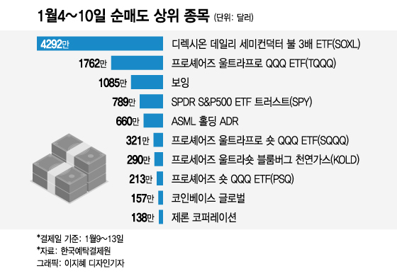 서학개미들은 반도체주 상승시 3배 수익을 얻는 디렉시온 데일리 세미컨덕터 불 3배 ETF(SOXL)를 4292만달러로 가장 많이 팔아 치웠고 나스닥100지수 하락시 3배 수익을 얻는 프로셰어즈 울트라프로 QQQ ETF(TQQQ)를 2번째로 많은 1762만달러 순매도했다.