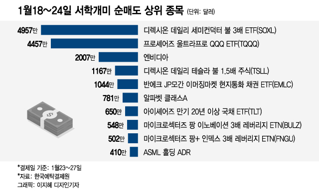 지난 18~24일 동안 서학개미들은 각각 나스닥100지수와 ICE 반도체지수가 하락할 때 3배 수익을 얻는 프로셰어즈 울트라프로 숏 QQQ ETF(SQQQ)와 디렉시온 데일리 세미컨덕터 베어 3배 ETF(SOXS)를 2551만달러와 1550만달러 순매수했다.