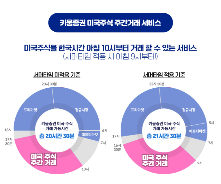 키움증권에서는 그 동안 서머타임 미적용 기준 프리마켓(한국시간 기준 오후 6시~밤 11시30분), 정규시장(밤 11시30분~오전 6시)과 애프터마켓(오전 6시~7시) 시간에 미국주식 거래가 가능했다.