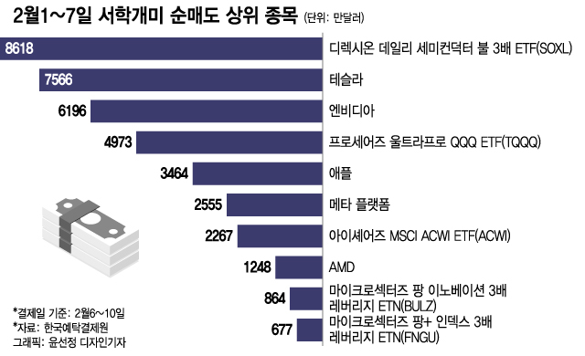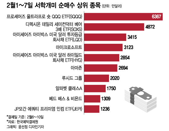 지난 1~7일 사이에 서학개미들이 가장 많이 순매수한 2개 종목은 각각 나스닥100지수와 ICE 반도체지수가 하락할 때 3배 수익을 얻는 프로셰어즈 울트라프로 숏 QQQ ETF(SQQQ)와 디렉시온 데일리 세미컨덕터 베어 3배 ETF(SOXS)였다.