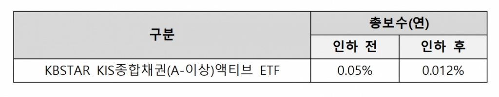 이번에 인하되는 'KBSTAR KIS종합채권(A-이상)액티브(105,620원 ▲490 +0.47%)'는 2021년 5월 상장된 순자산 7800억원 규모의 채권 대표지수 ETF다.