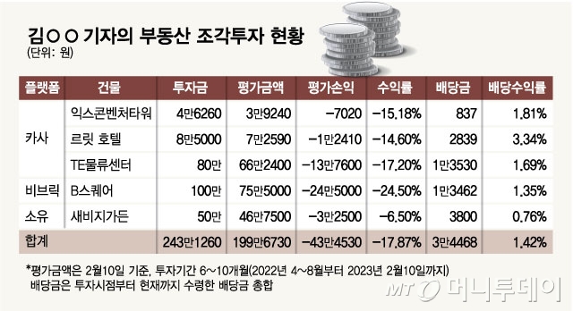 결론부터 말하자면 지난 10일 기준 수익률은 마이너스(-) 18%. 투자기간 6~10개월 동안 약 40만원의 손실을 봤다. 총 수령한 배당금은 약 3만5000원, 배당수익률은 1.4% 정도다. 시세차익도, 임대수익도 모두 성공적인 투자라 볼 수 없다.