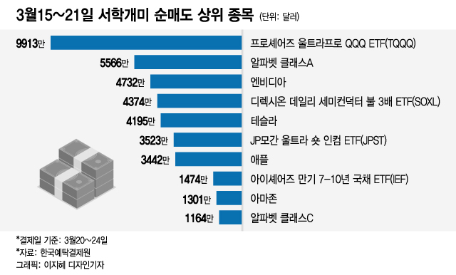 이 기간 동안 서학개미들이 가장 많이 순매도한 종목은 나스닥100지수의 하루 수익률을 3배 추종하는 프로셰어즈 울트라프로 QQQ ETF(TQQQ)로 9913만달러를 팔아 치웠다.