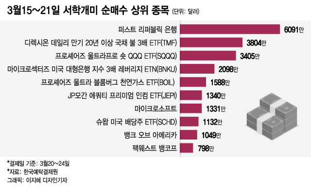 반면 서학개미들이 가장 많이 순매수한 종목은 뱅크런으로 주가가 폭락한 퍼스트 리퍼블릭 은행이었다. 서학개미들은 미국 금융당국이 퍼스트 리퍼블릭 은행까지 무너지도록 내버려 두지는 않을 것으로 믿고 일주일간 6091만달러를 순매수했다