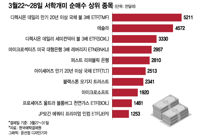 지난 22~28일 동안 서학개미들이 가장 많이 순매수한 종목은 디렉시온 데일리 만기 20년 이상 국채 불 3배 ETF(TMF)로 5211만달러의 매수 우위를 나타냈다.