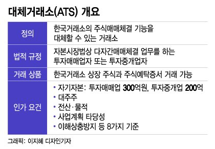 ATS는 한국거래소(정규거래소)의 증권매매체결 기능을 대체할 수 있는 거래소다. ATS에서 거래할 수 있는 증권은 한국거래소 상장 주식과 주식예탁증서(DR)로 제한한다. 한국거래소 외에도 주식을 거래할 수 있는 대체통로가 생기는 것으로, 거래수수료 인하와 호가단위 축소, 거래체결 속도 개선 등 선순환 효과가 기대된다.