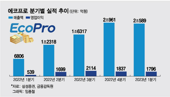 한편 지난 1분기 에코프로의 연결기준 잠정 매출액은 2조589억원, 영업이익은 1796억원을 기록했다. 매출액은 전년 동기 보다 202.5%, 영업이익은 233.2% 증가했다. 시장 기대치와 유사한 수준이었다. 에코프로비엠의 경우 1분기 잠정 영업이익이 1037억원으로 전년 동기 보다 161.3% 증가했고 그룹 전체 영업이익에 60%에 달하는 수치를 기록했다.