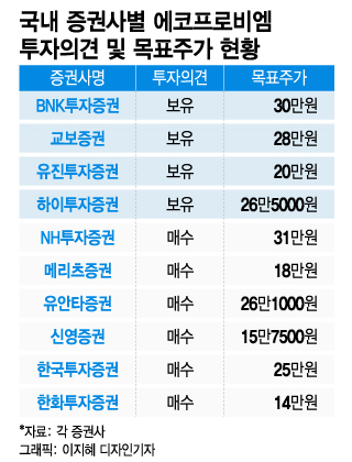 에코프로만이 아니다. BNK투자증권, 교보증권, 유진투자증권, 하이투자증권은 에코프로비엠에 대한 투자의견을 '매수'에서 '보유'로 하향 조정했다. 매수 의견이 대부분인 국내 증권사에서 보유로 조정한 건 사실상 매도하라는 것으로 판단될 때가 많다. 네 증권사에서 제시한 목표주가 평균치는 26만1250원으로 현 주가(27만6000원) 보다 낮다.