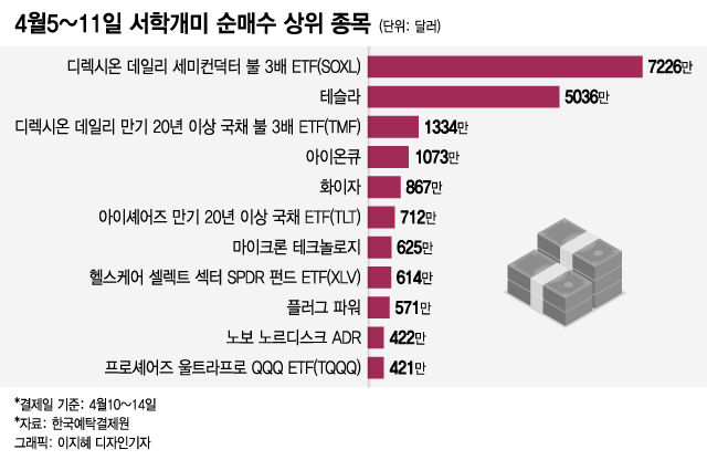 이 기간 동안 서학개미들이 가장 많이 순매수한 종목은 ICE 반도체지수가 오를 때 3배 수익을 얻는 디렉시온 데일리 세미컨덕터 불 3배 ETF(SOXL)로 7226만달러를 순매수했다.