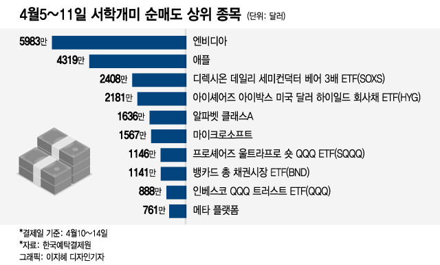 한국예탁결제원에 따르면 서학개미들은 지난 5~11일 미국 증시에서 6318만달러의 매도 우위를 나타냈다.(결제일 기준 4월10~14일)